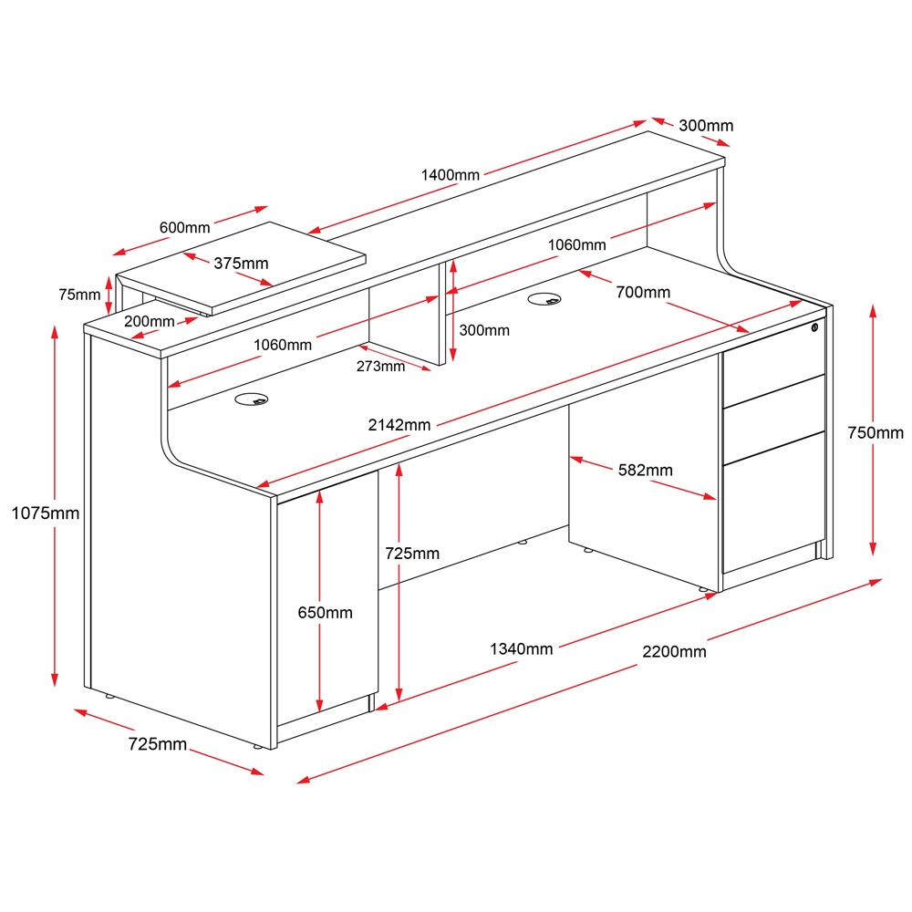 - 2200mm W x 800mm D x 1150mm H – Worksurface: 25mm thick x 730mm high